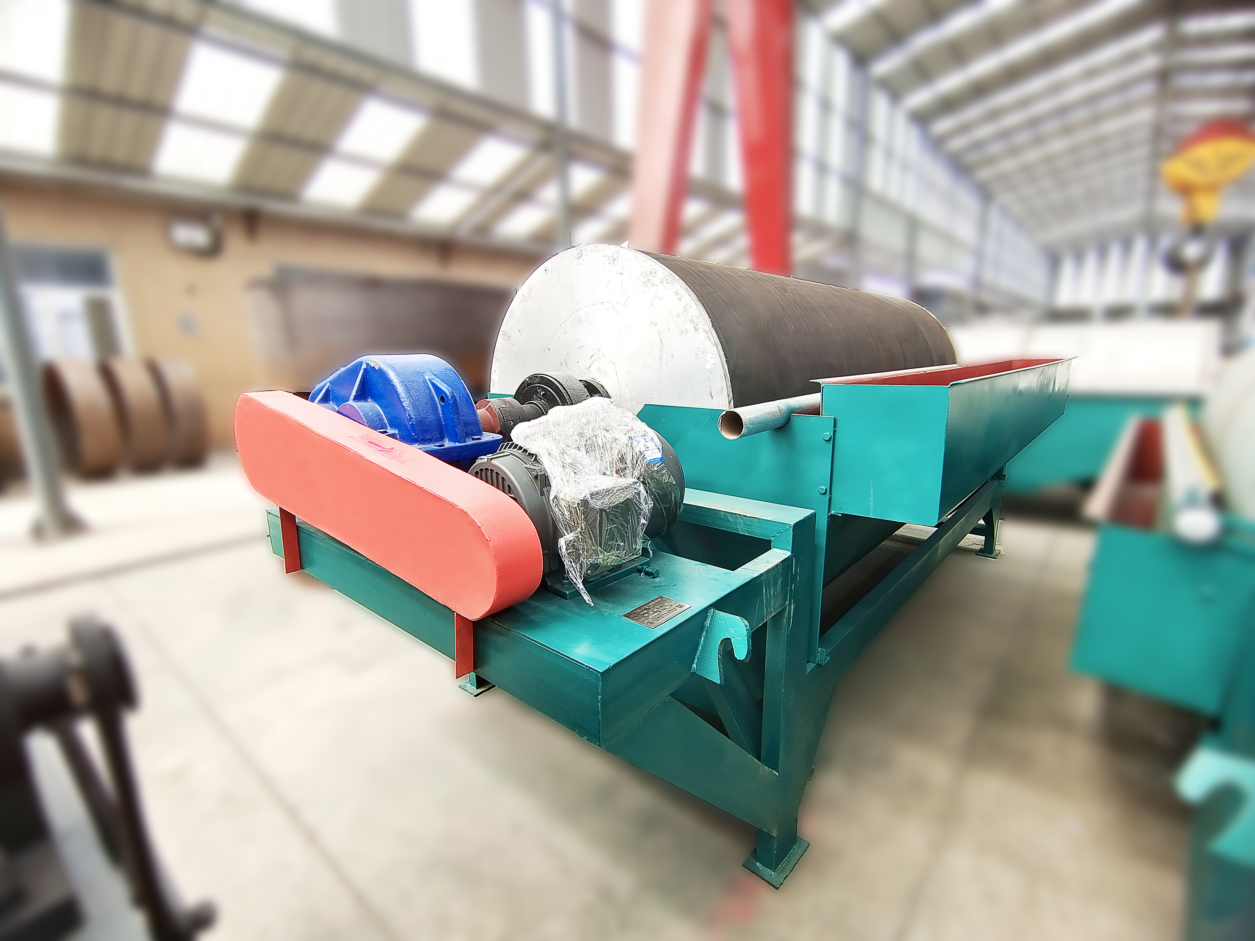 其原理是当矿浆进入磁场区时,其中强磁性矿物被吸附在圆筒表面,弱磁性和非磁性矿物被水流冲洗排出,而吸附在圆筒表面上的磁性矿物随圆筒旋转,被带出磁场区,用冲洗水冲入精矿槽中,完成分选作业。